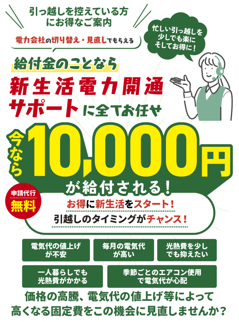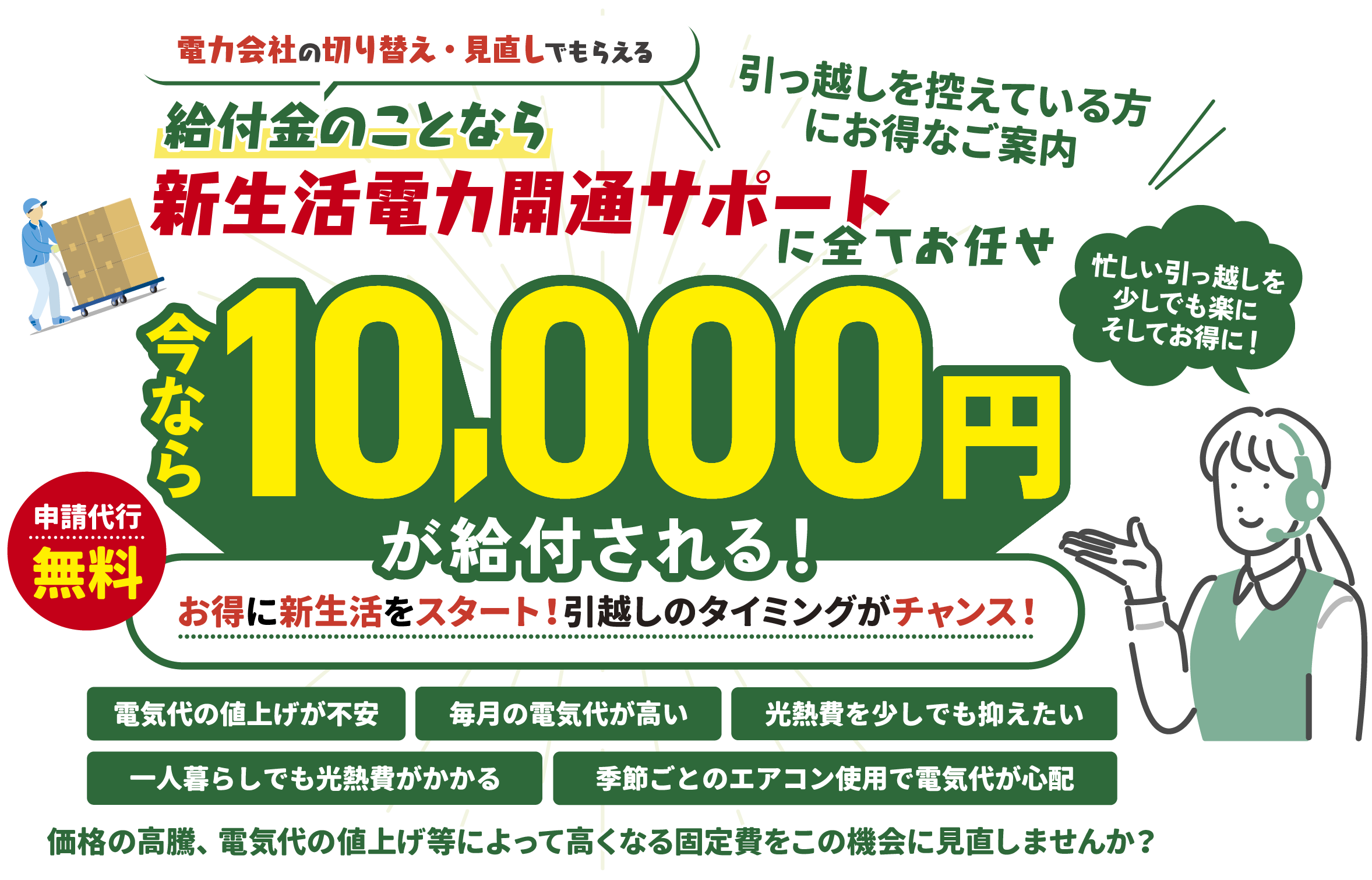 新生活を始める際は、家賃や敷金・礼金、家具・家電など、何かと初期費用がかかります。新生活電力開通サポートを活用すれば、電気契約を切り替えるだけで、少しでも費用の負担を軽くすることができます。